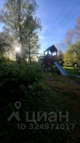 Огороженая детская площадка с домиком. Цветник, небольшая теплица, грядки.