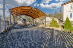 Удобные подъездные пути к дому, откатные ворота. Тротуарной плиткой выложена парковка на два автомобиля, дорожки к дому, в саду. Над парковочным местом сооружён навес.