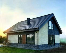Конструкция дома выполнена из керамзито-бетонных блоков с долговечной фасадной отделкой искусственным камнем.