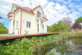 Отопление во всем доме через теплый пол. На первом этаже санузел (совмещенный), кухня- гостиная, большая гардеробная, панорамные двери с выходом на сторону пруда!