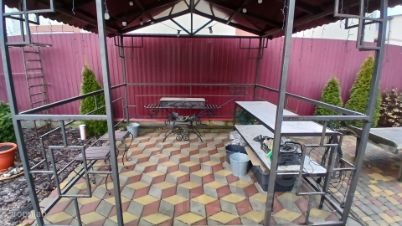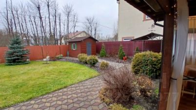 Двор виден на фотографиях, всё в плиточке, газон, есть плодовые деревья, мангальная зона, вокруг тишина и спокойствие.