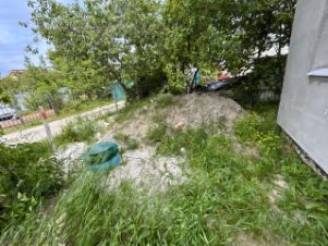На участке есть не достроенное строение из кирпича, в котором можно сделать гараж с баней или разобрать и сделать парковочное место.