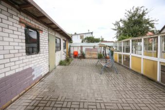 Ухоженный участок с зелёными насаждениями, хозпостройками для хранения инвентаря и велосипедов.