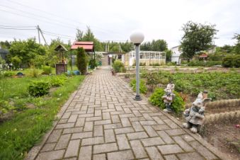 Участок очень зелёный и ухоженный, растут фруктовые деревья, множество грядок, цветы , дровяник, , качели .