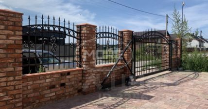 Кирпичный забор с коваными решетками и откатными воротами, управление с пульта,