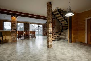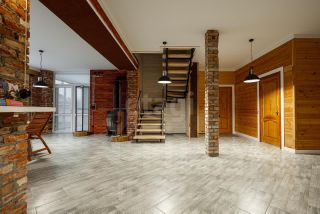 Дом построен из керамического блока с отделкой под дерево, кровля из натуральной черепицы. На первом этаже расположены кухня-гостиная, подсобные помещения, оранжерея, гостевые санузлы и просторная терраса. Второй этаж занимают шесть изолированных спален и большая гостиная. Высота потолков — 3 метра, во всех помещениях теплые полы и керамогранит.