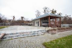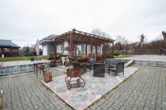 На территории - баня на дровах в современном стиле с ротанговой мебелью, с крытой беседкой, а также с помещением для хоз.нужд.