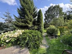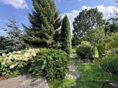 Участок 25 соток с великолепным ландшафтным дизайном структурирован: огород, декоративная зона, фруктовый сад.