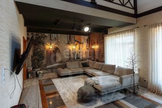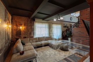 Двухэтажный дом плoщадью 300 кв.м., 2019 года постройки, выполненный "под старину" в тюдоровском стиле, с отделкой фасада из керамического кирпича, булыжников циклопической кладки на стенах и черепичной крышей.
