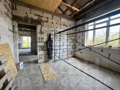 Дом построен из газосиликата толщина стен 30 см , фундамент монолитная плита 30 см , крыша профильная металлочерепица.