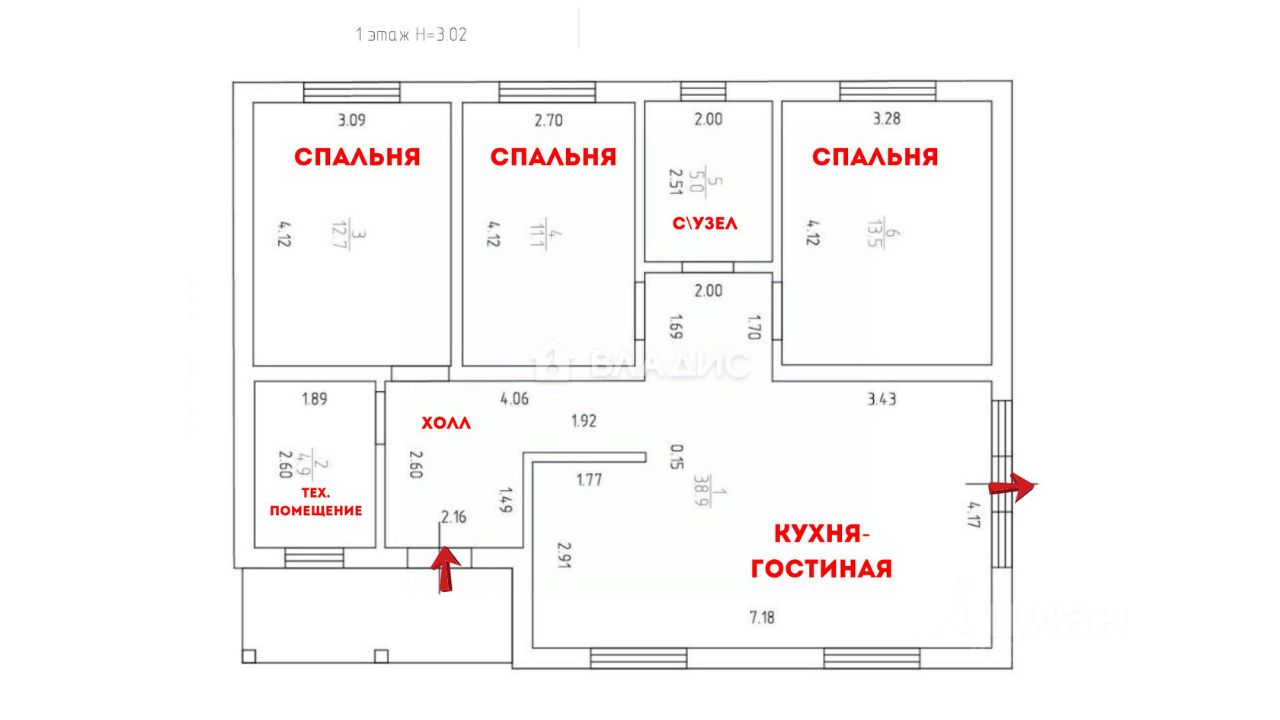 - 3 спальни - 13.5 + 12.7 +11.1 м²