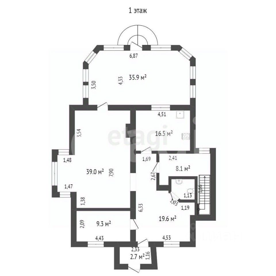 На первом этаже: широкий холл 20 кв.м., гардеробная 9 кв.м., гостиная 39 кв.м, зимний сад 36 кв.м, кухня 16,5 кв.м, прачечная 8 кв.м., санузел 2,5кв.м, лестница 4,2 кв.м.