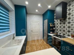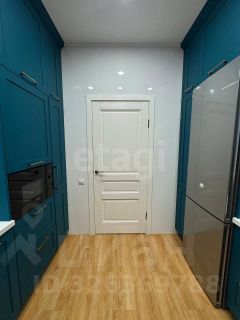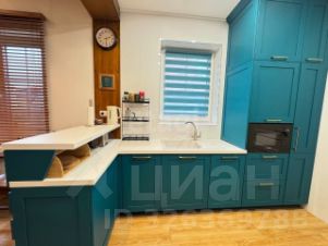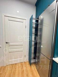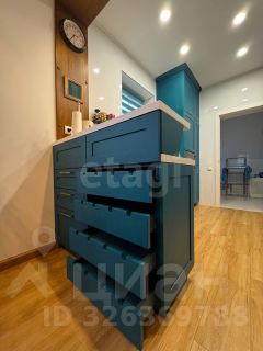 Кухня цвета бирюзового неба с множеством ящиков и супер техникой.