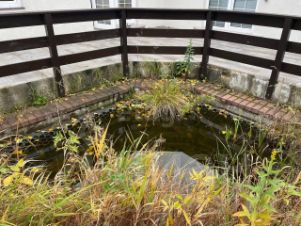 Японская беседка с прудом, в котором плавают рыбки.