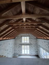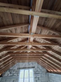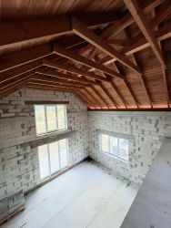 ** Крыша**: Стропильная система из экспортного пиломатериала с заводским антисептированием. Использованы заводские фермы по индивидуальному проету с расчетом нагрузок на крышу для организации второго света. Сплошной настил доской черновой обрешетки .