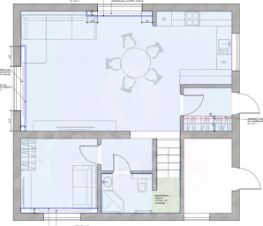 Первый этаж: просторная кухня совмещенная с гостиной площадью 38 м2, кабинет 10 м2, санузел 5,5 м2, прихожая 4м2, а также техническое помещение с отдельным входом, где установлены все системы жизни-обеспечения дома. Из гостиной предусмотрен выход на террасу площадью 12 м2 и внутренний двор. Лестница на второй монолитная. Есть большое окно на лестничном проёме.