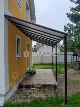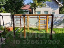 Выход из гостиной на мангальную зону, детский уличный уголок. На участке есть небольшой деревянный домик для детей.