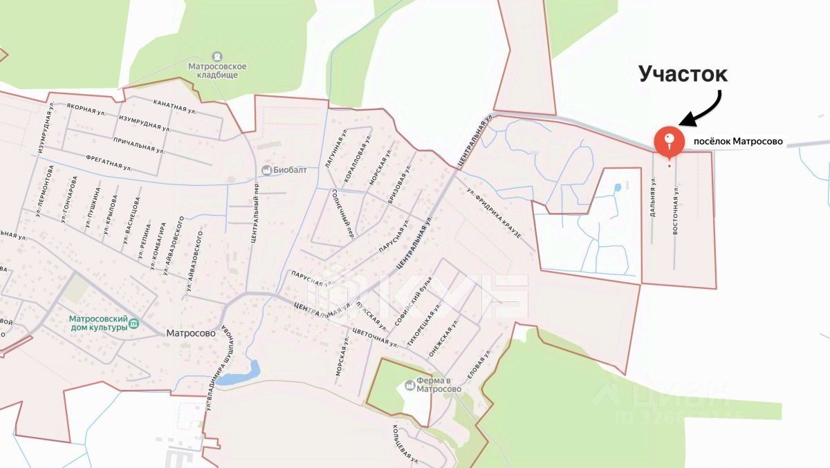 Участок расположен в поселке Матросово Гурьевского района Калининградской области (адрес: Калининградская область, р-н Гурьевский, п Матросово, ул Восточная, 4).