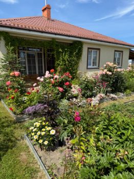 Участок разработан. Много цветов (самых разнообразных), хвойные и плодовые деревья, клубника, малина, смородина, крыжовник, черешня, персики, слива, вишня и многое другое