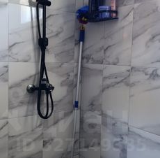 Баня с душем внутри дома, совмещенный санузел, шкафчики под раковиной, зеркало, шкафчик для хранения.