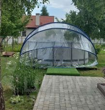 Участок сухой и ровный . Имеется теплица, парковка, хоз.постройка, дровник для мангала, крытый бассейн.