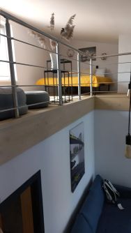 На полу уложена плитка, смонтирован теплый пол (электрический). На второй этаж-антресоль ведёт удобная лестница из натурального дерева.