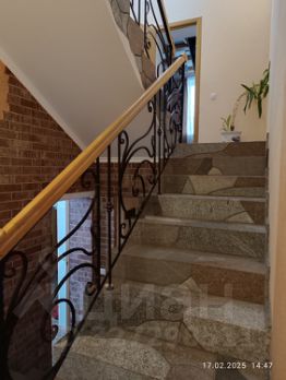 Лестница на второй этаж выложена натуральным гранитом. Перила кованые, поручни из дуба.