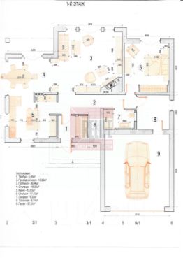 Первый этаж: кухня-столовая, зал (с действующим камином), гостевая спальня (с выходом на террасу), сан. узел, техническая комната (газовый котел Bosch, накопительный бак на 200 литров, фильтры для воды, сервер видеонаблюдения, стиральная машина), отапливаемый гараж на два автомобиля, с системой хранения велосипедов.