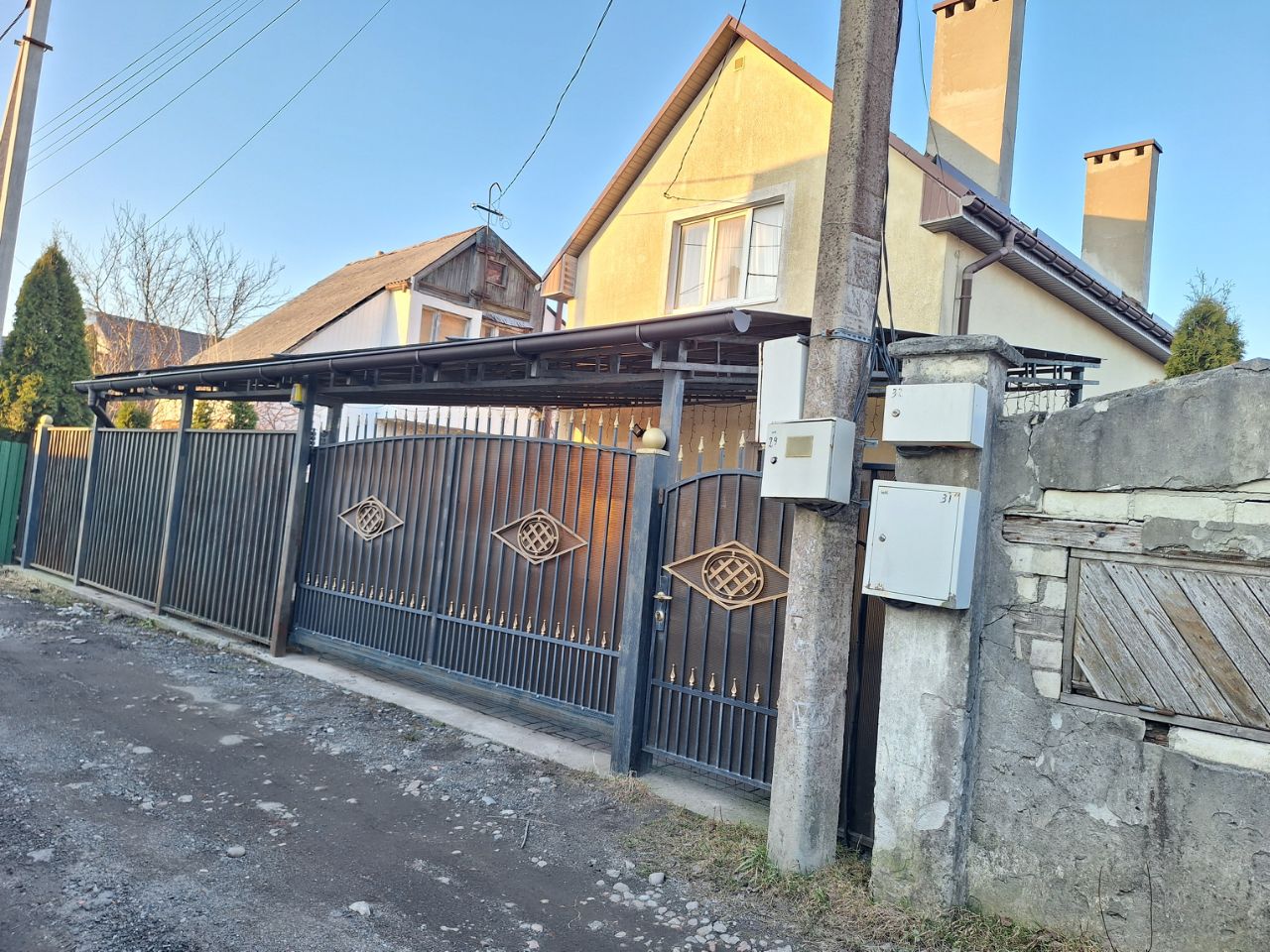 В дом проведен газ, стоит двухконтурный газовый котел, водоснабжение осуществляется через скважину, а канализация — биосептик.