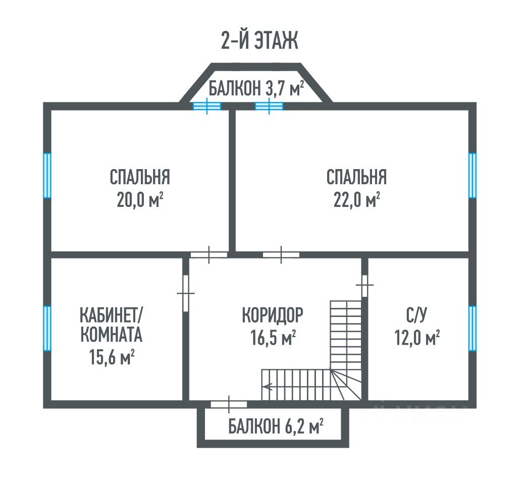 На 2 этаже: 2 спальных комнаты 22+20 кв.м., кабинет 15.6 кв.м. который при необходимости можно использовать как дополнительную спальню, санузел, коридор и 2 балкона.