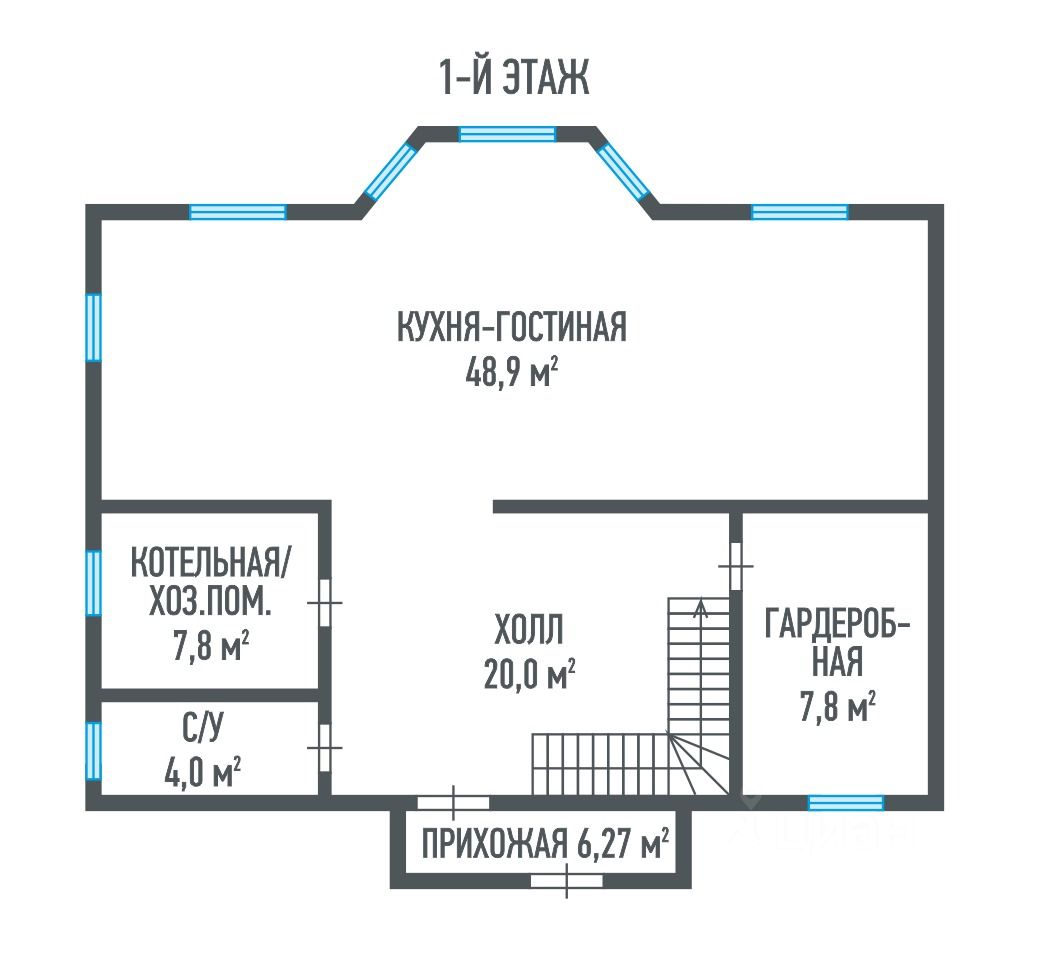 На 1 этаже расположены просторная кухня-гостиная 48.9 кв.м., холл, зона прихожей, гардеробная, котельная, санузел.