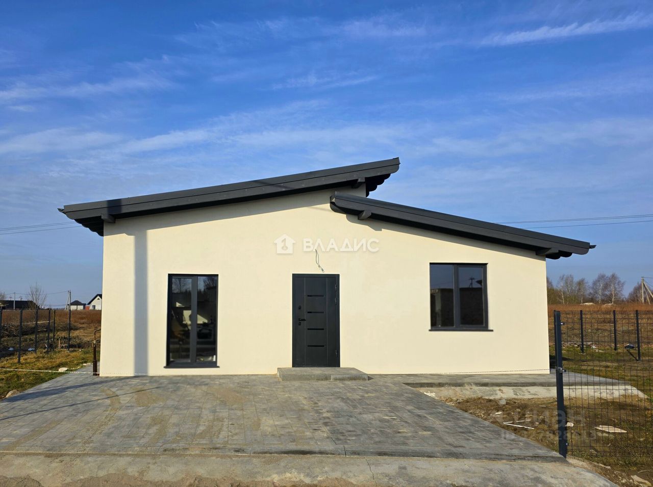Отмостка вокруг дома и парковочные места вымощены тротуарной плиткой.