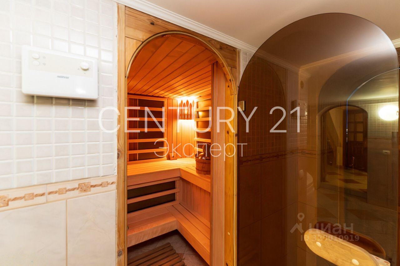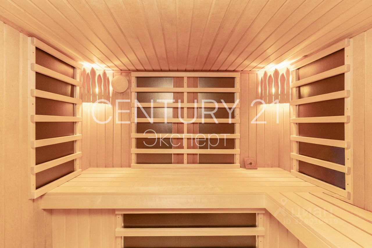 В доме предусмотрены три спальни, три санузла, просторная кухня-гостиная, сауна, бассейн, спортивный зал, а также гараж.