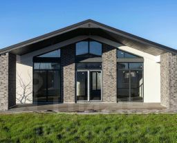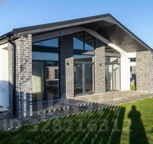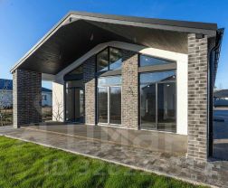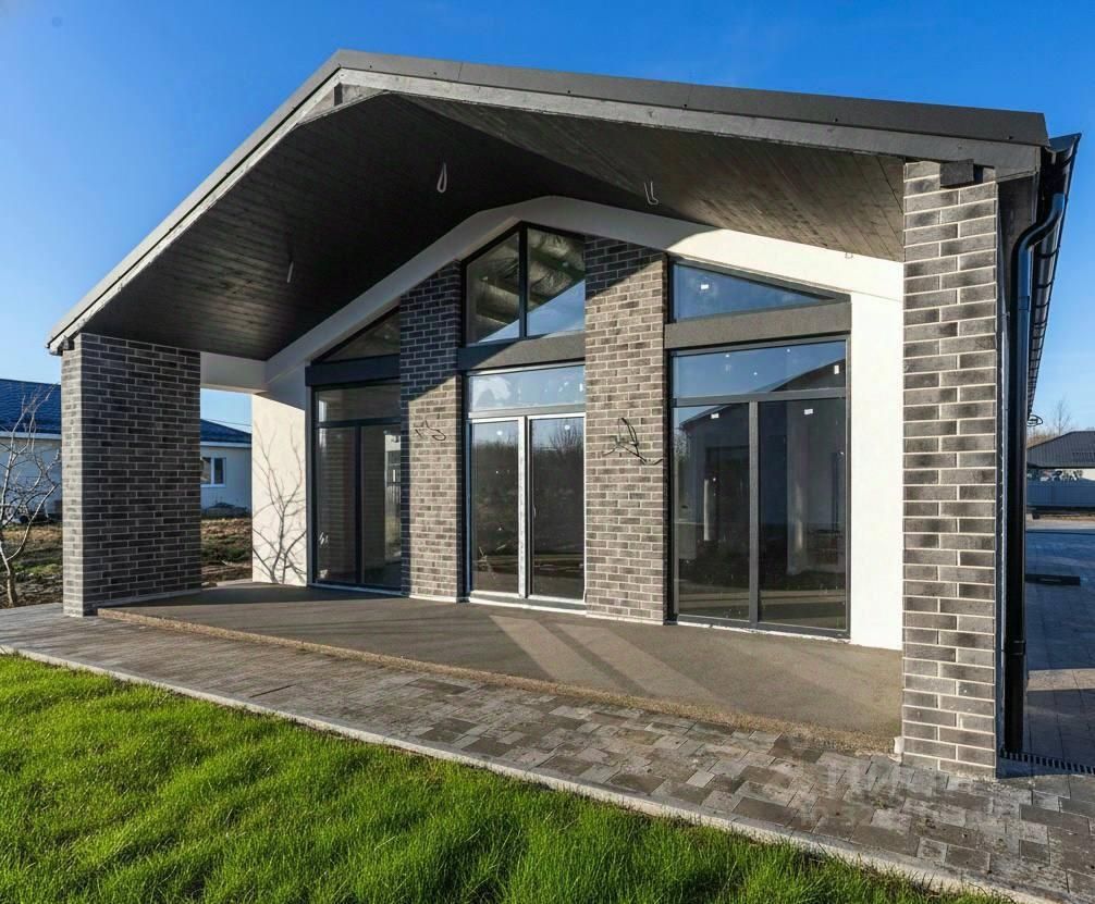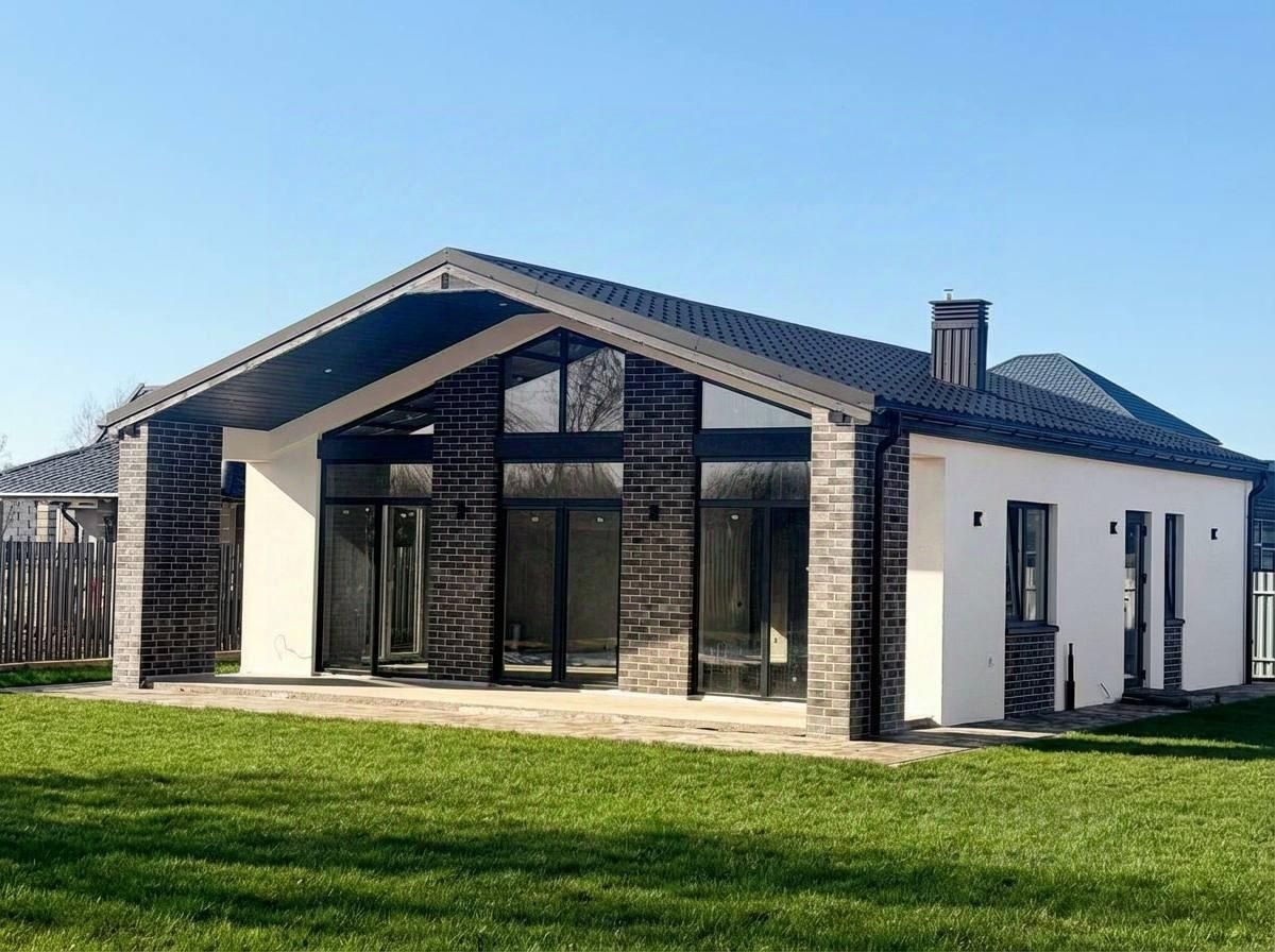 Современный стиль бархаус — лаконичный, стильный и функциональный. Фасад выполнен из белой декоративной штукатурки с акцентами из серого кирпича.