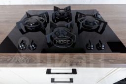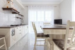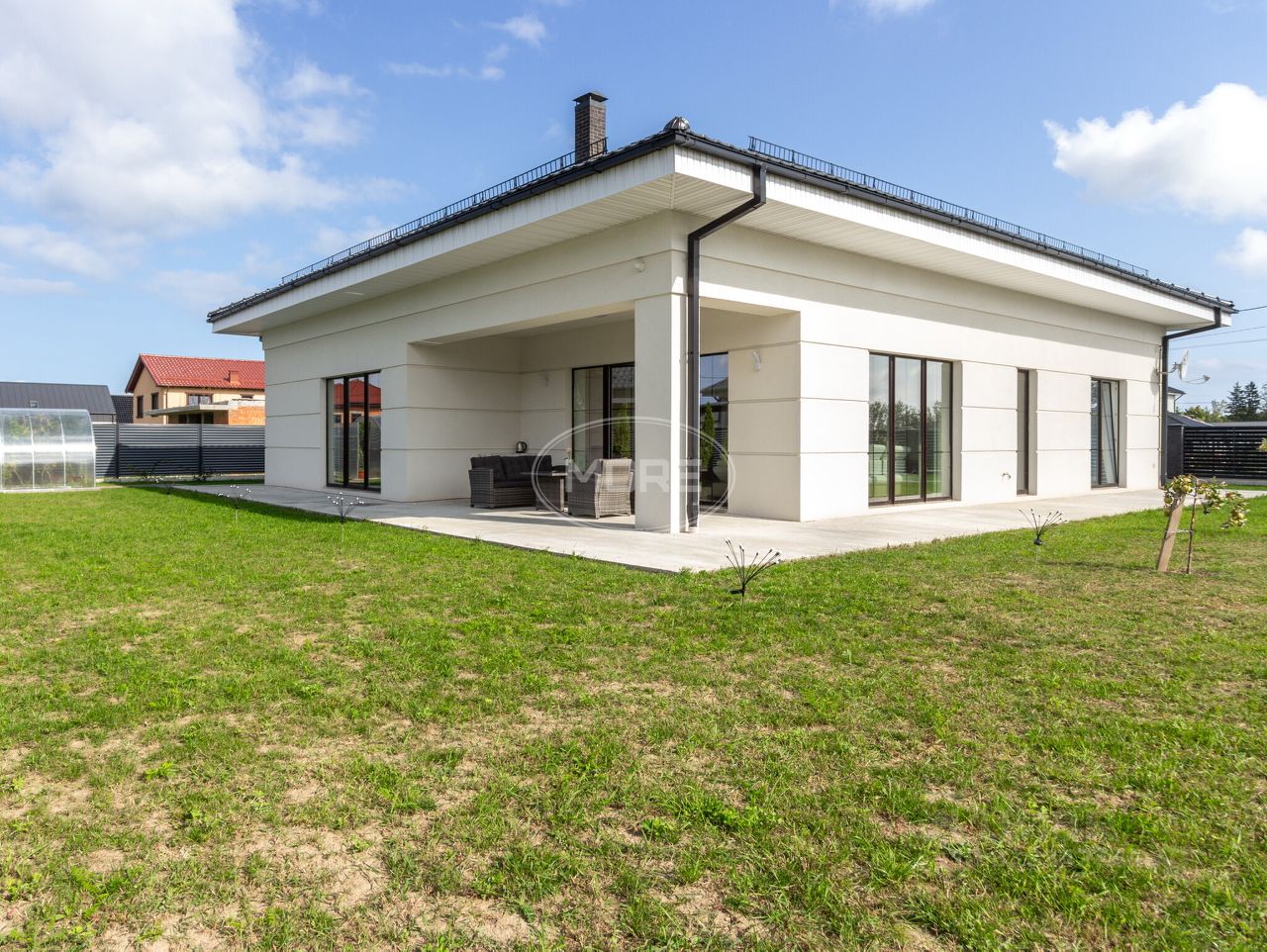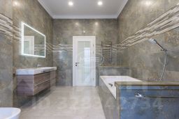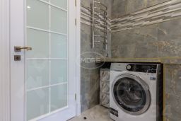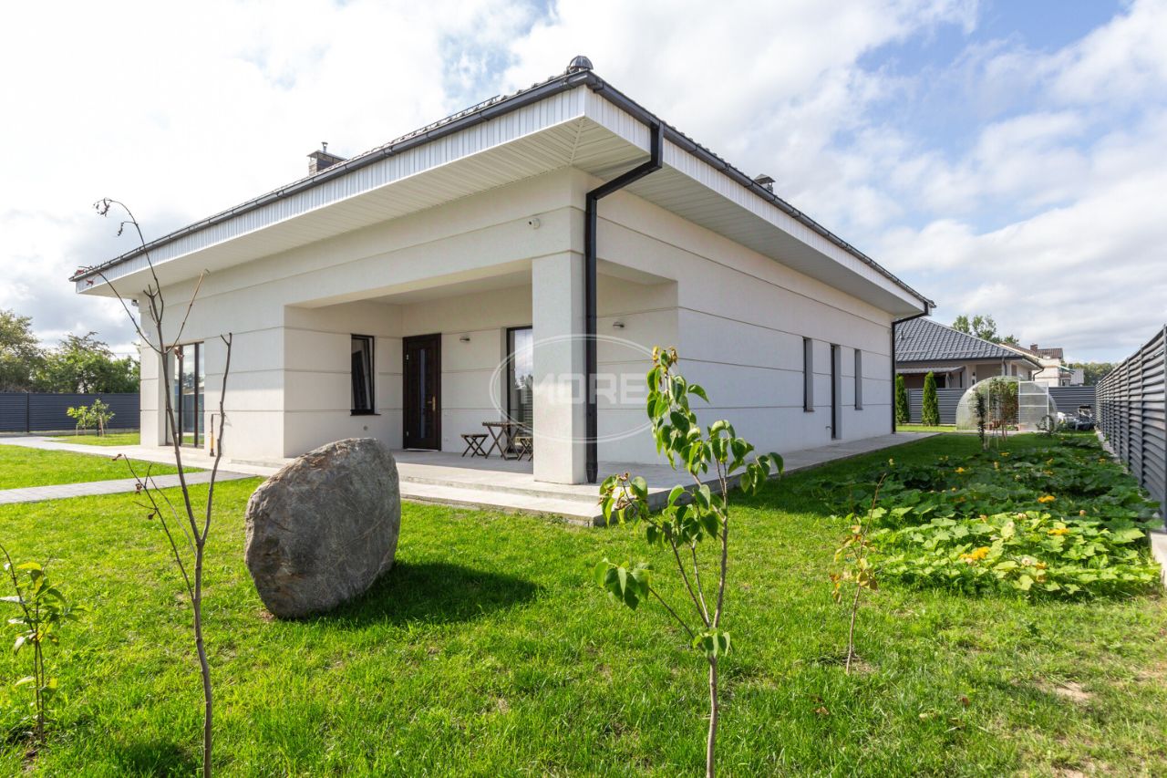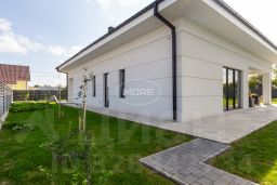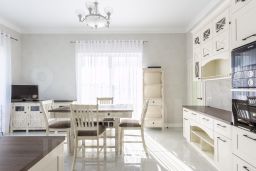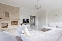 На первом есть этаже подогрев полов. Высота потолков 3,5 метра. Из просторной гостинной, площадью 49 м2 выход в кухню 25,5 м2 и на открытую террасу в сад. В доме еще есть две отдельных комнаты, два санузла. Межкомнатные двери деревянные из ясеня.