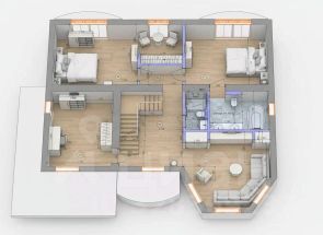 1 этаж: прихожая, гостевой и общий санузлы, ванная, кухня-гостиная с видом на воду и столовой зоной, холл с камином, спальня с санузлом, комната для уединения.