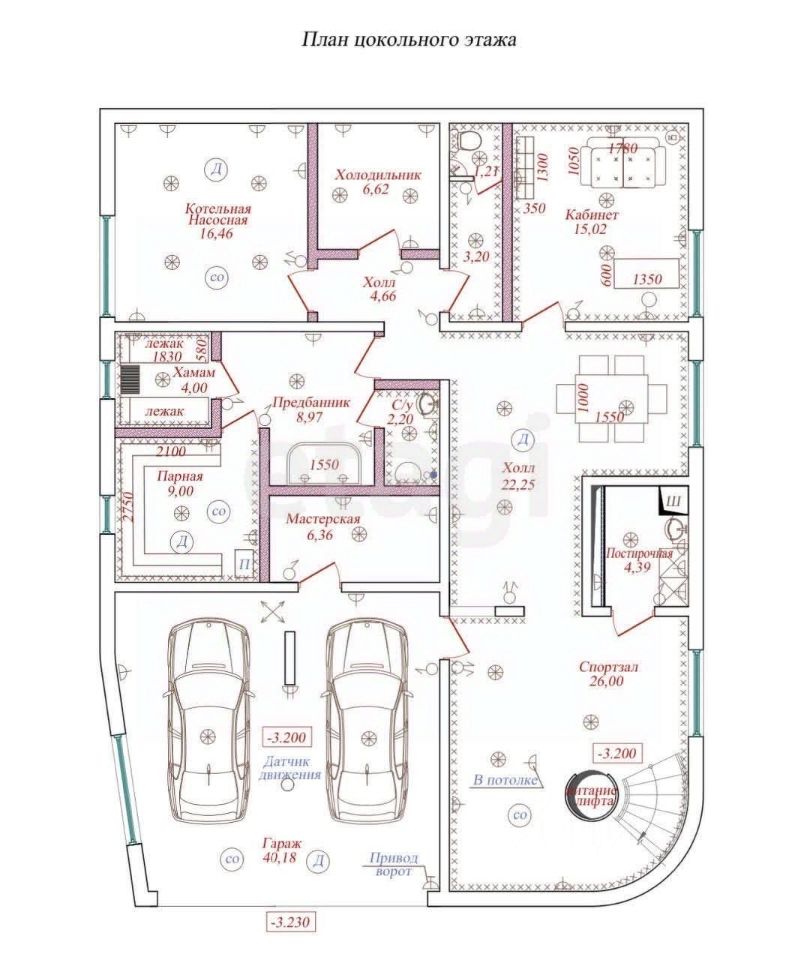 - полуцоколь (гараж на 2 авто, баня, хаммам, помещение для персонала, кабинет, комната для хранения продуктов, санузел, душевые, раздевалка, мастерская, постирочная, котельная;
