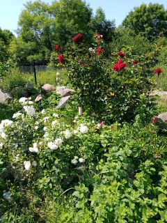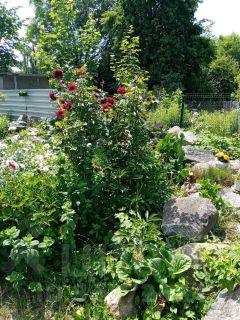 Фруктовый сад: черешня, яблони, сливы, смородина, малина, крыжовник, виноград.