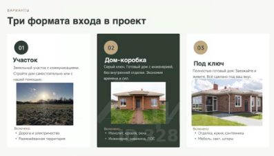 • Сервис: Предлагаем 3 варианта реализации: от просто земли до дома с отделкой Серый ключ или Под ключ с мебелью.