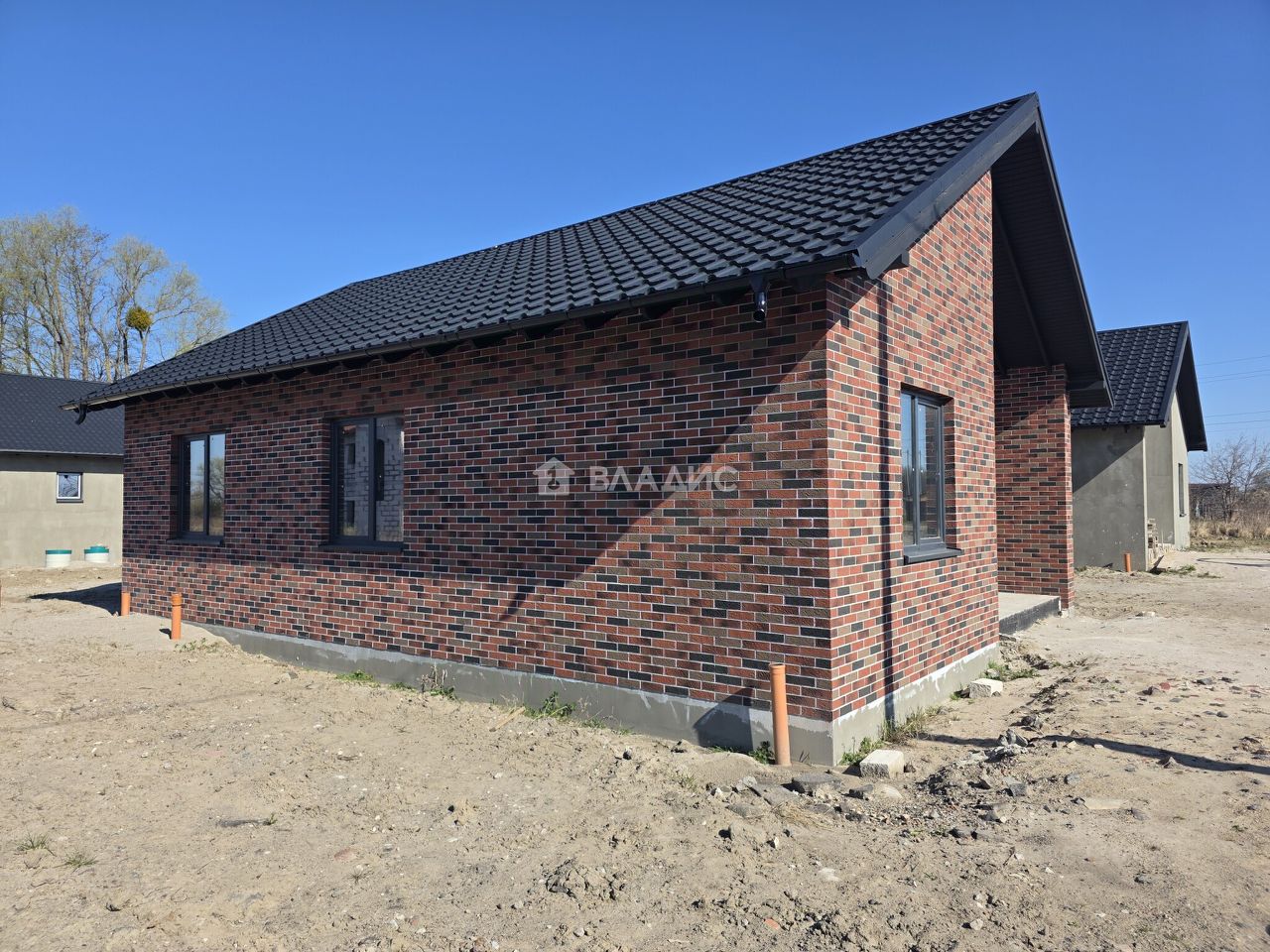Отмостка вокруг дома и парковочные места вымощены тротуарной плиткой.
