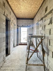 -на стенные блоки размещён мауэрлат, он обеспечивает надёжное крепление стропильной системы к стенам здания, что важно для устойчивости и долговечности всей конструкции,