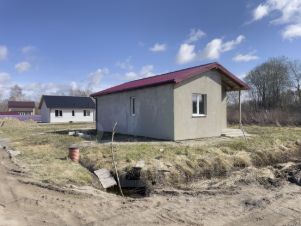 Дом 70 кв.м с террасой построен в 2025 году из газосиликатных блоков, утеплен. Внутри две комнаты, кухня-гостиная, санузел, выполнены штукатурные работы, заведено электричество, установлены розетки и выключатели. Заведено водоснабжение и канализация. На участке сделан дренаж.
