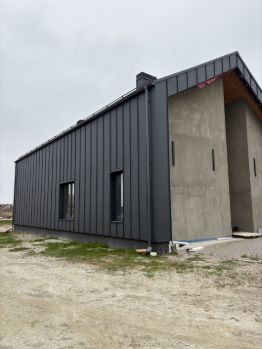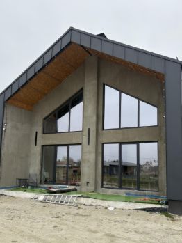 Стены оштукатурены известковой штукатуркой. Кровля выполнена из немецкого металла (закуплен до санкций). Листы прокатывались на месте, при нагреве и охлаждении не деформируются. Установлены качественные трёхкамерные стеклопакеты. На кухне — откатные двери с надёжной фурнитурой. Дверные проёмы высотой 2,3 метра. Сделаны ниши под скрытый плинтус с подсветкой.