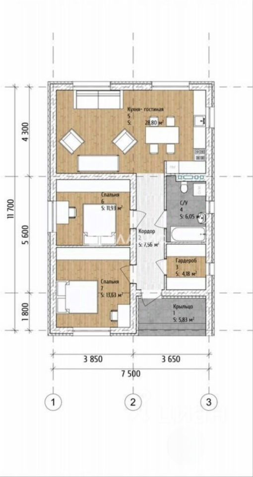 Плaниpовка - просторная кухня-гостиная, 2 спальни, санузел, гардероб.