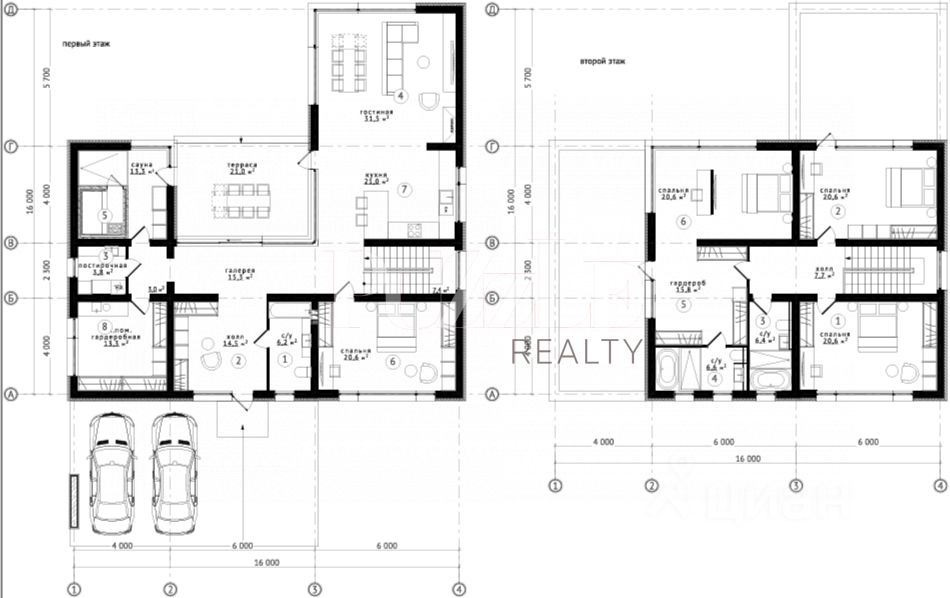 Первый этаж — это центр притяжения для всей семьи: гостиная 31,5 кв. м с выходом на террасу, кухня 21 кв. м, спальня 20,6 кв. м, холл, санузел, техническое помещение 13,3 кв. м, постирочная и SPA-зона. Навес на 2 автомобиля для вашего удобства.