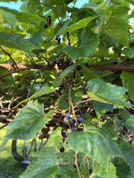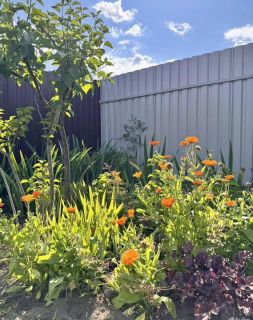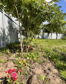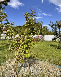 яблони, груши, сливы, черешни, вишни, черноплодная рябина, калина, кусты черной и белой смородины, йошты, крыжовника, 2 сорта винограда, малина и клубника, цветы и цветущие кустарники.