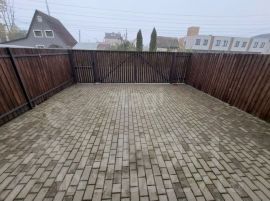 Участок полностью благоустроен: передний двор вымощен тротуарной плиткой, огорожен деревянным забором с калиткой и воротами, что позволяет организовать парковку для нескольких автомобилей.