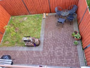 Задний дворик предназначен для отдыха, здесь оборудована зона барбекю, частично уложена плитка и сохранена зеленая зона для сада. Вся территория освещена и огорожена забором из профлиста под дерево.