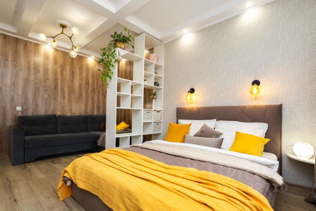 Всего размещается 3 чел - (2+1): кровать 2-ух спальная - 160х200, раскладное кресло-кровать - 90х190.