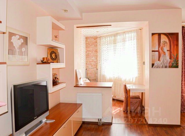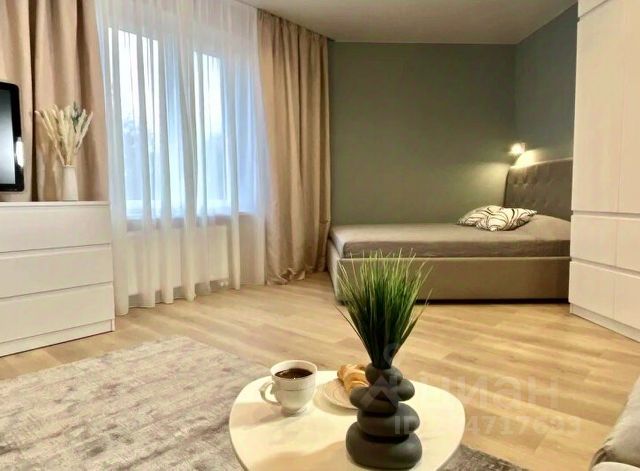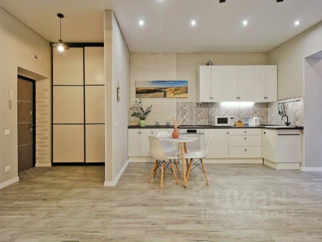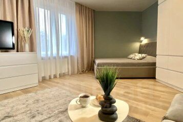 В квартире все предусмотрено для комфортного проживания гостей: зона отдыха с двухспальной кроватью и ортопедическим матрасом, отделенная стеклянной раздвижной перегородкой со шторами, зона гостиной с удобным диваном, кухня с обеденным столом и барной стойкой, лоджия с полноценным рабочим местом и уголком отдыха, просторная гардеробная для хранения вещей и багажа.